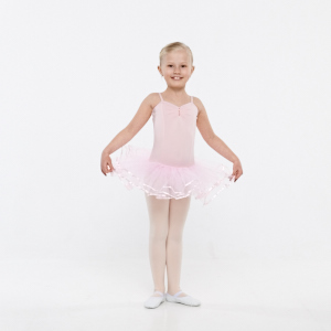 Stroppedrakt i polyester med tre lag tyll. Paljett detalj foran, og bånd på tutu skjørtet. De er litt små i størrelsen.