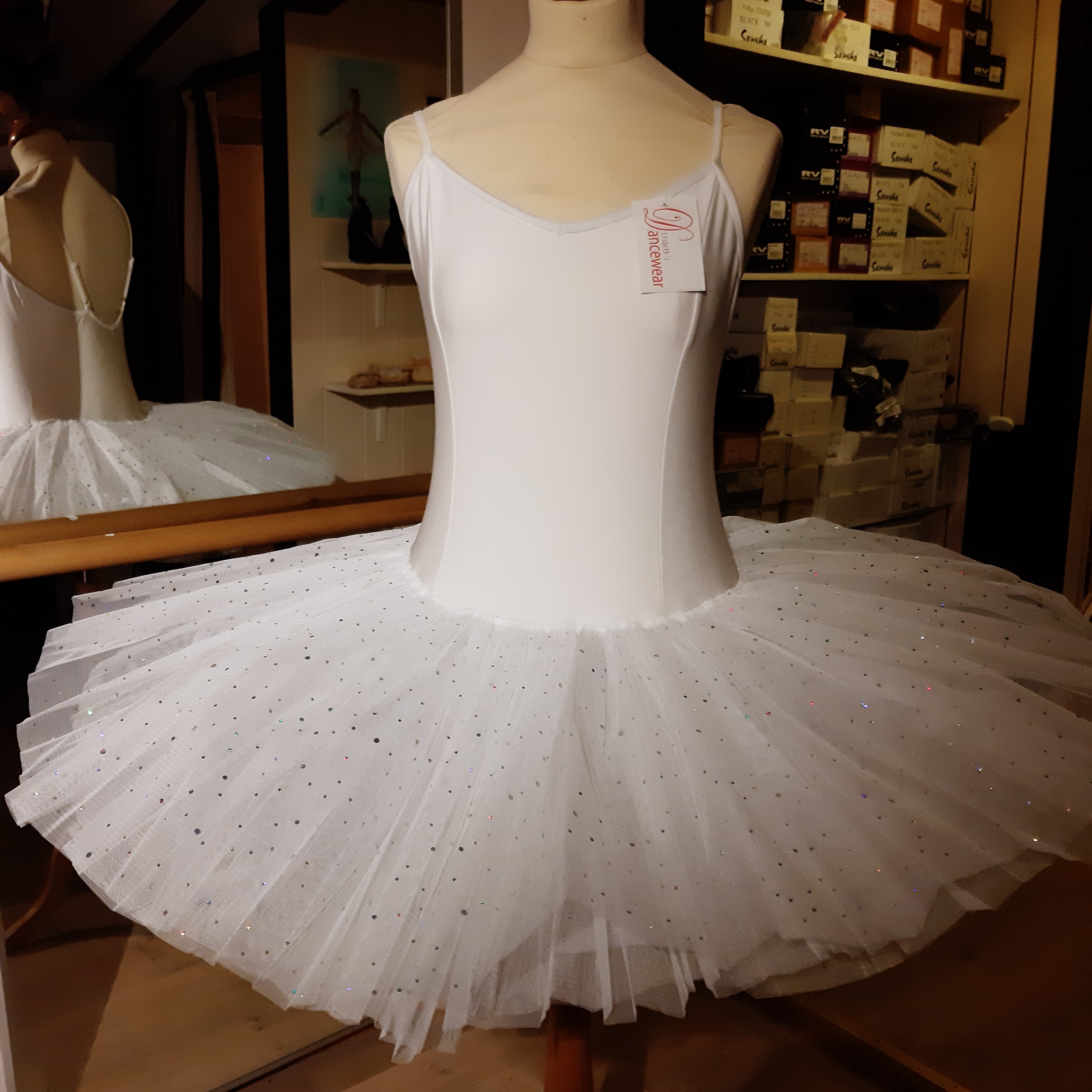 Drakt i nylon/lycra med fem lag tutuskjørt. Regulerbare stropper. Øverste lag har imiterte diamanter. NB! DE ER SMÅ I STØRRELSEN, GÅ OPP MINST EN STØRRELSE